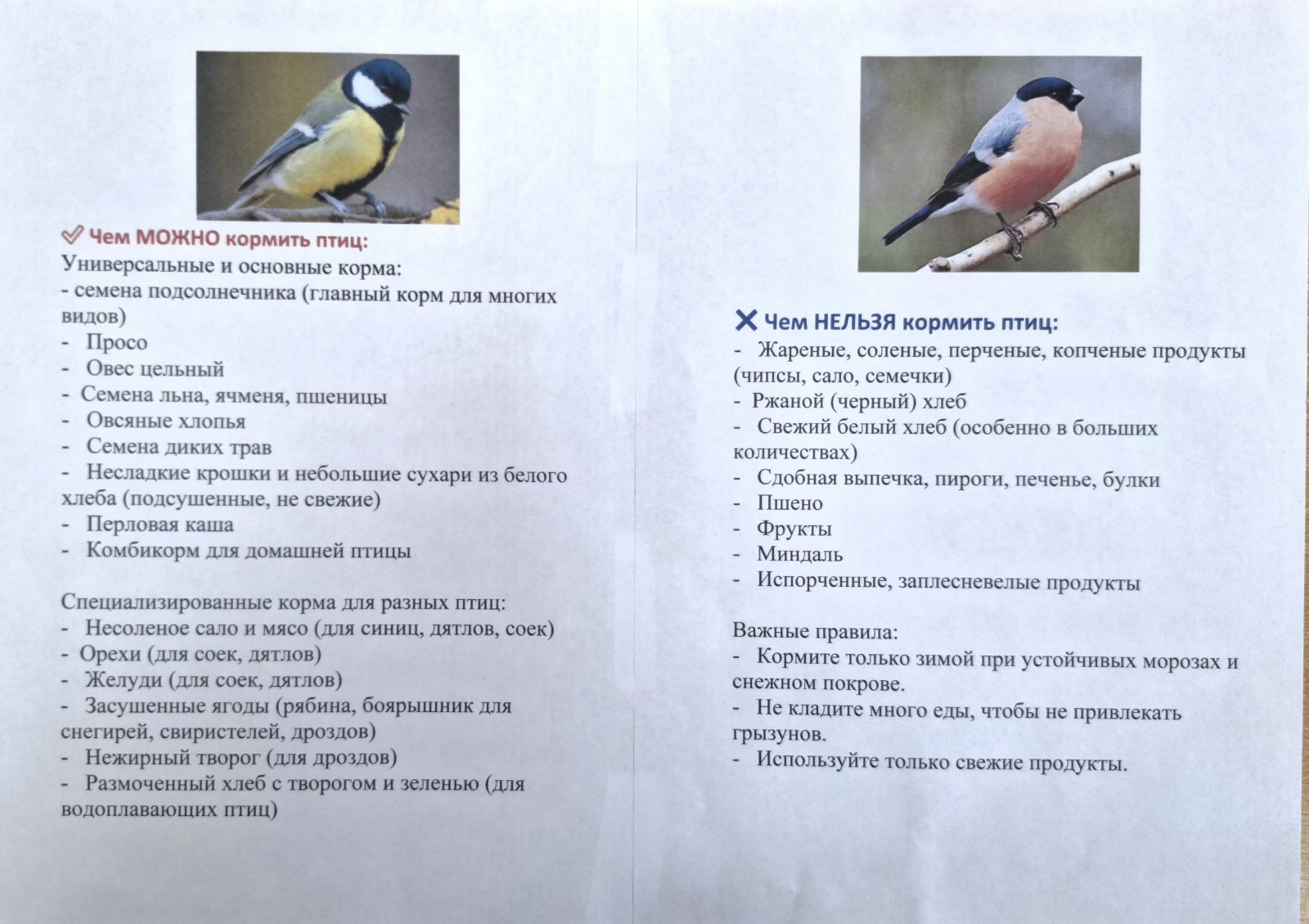 1️. Сначала мы с родителями изучили, что можно и нельзя нашим пернатым гостям. Составили свой список полезных угощений.