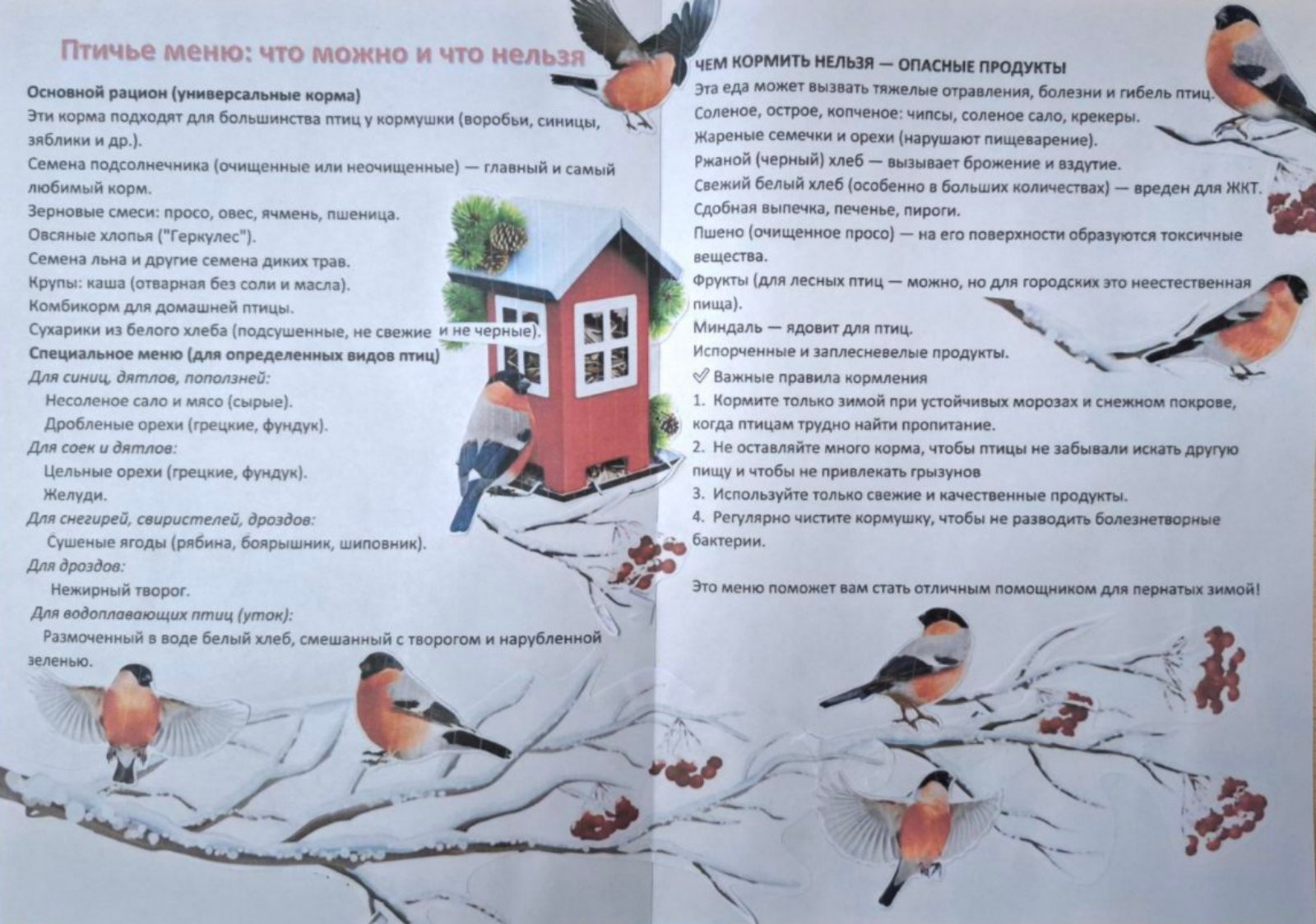 2️. Мы оформили яркое «Птичье меню». Теперь всегда под рукой подсказка, чем можно порадовать синичек и воробьев.
