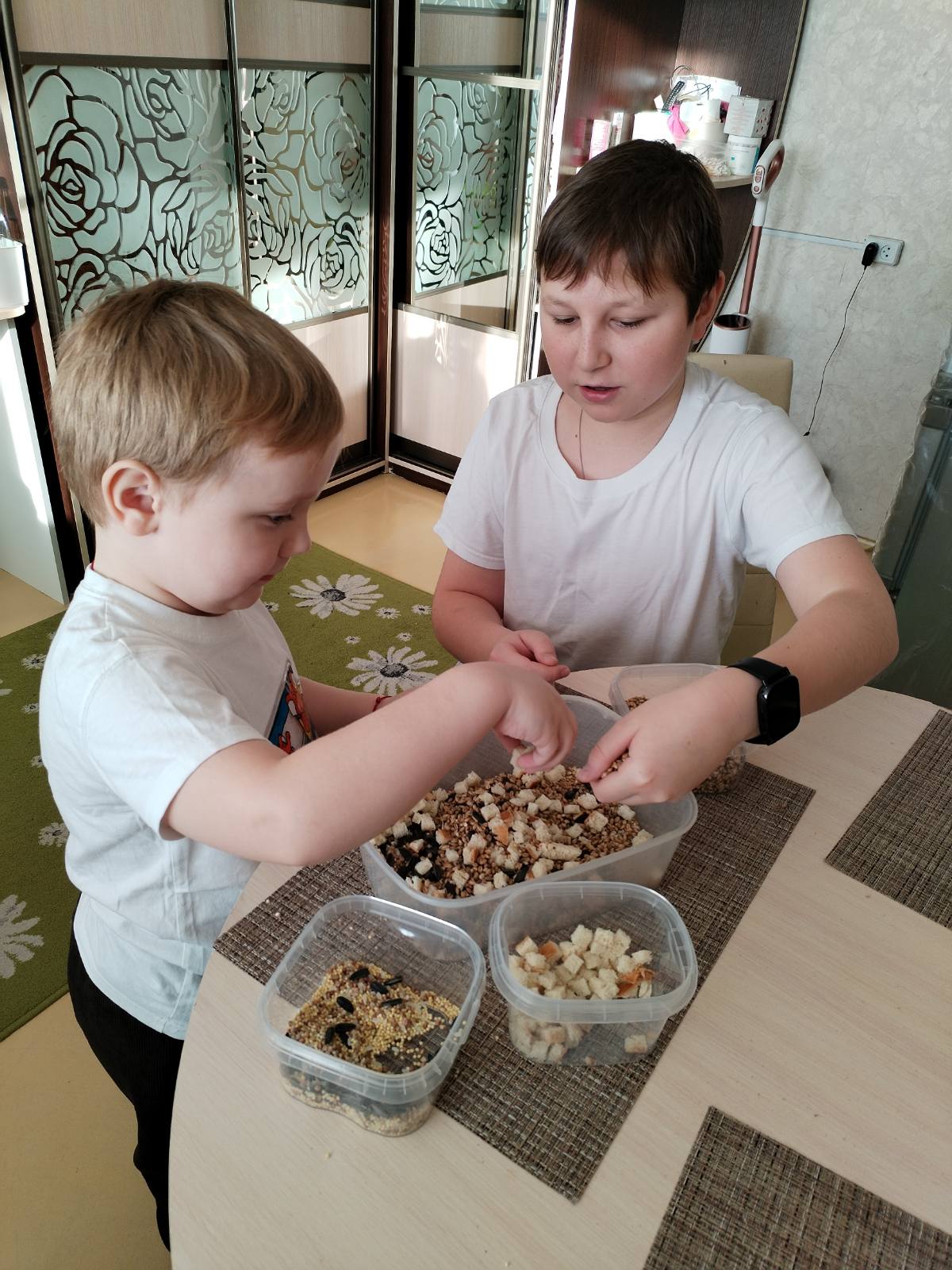 3️. Вся семья собралась на кухне, чтобы «приготовить» самую полезную зерновую смесь. Это так весело и объединяет!