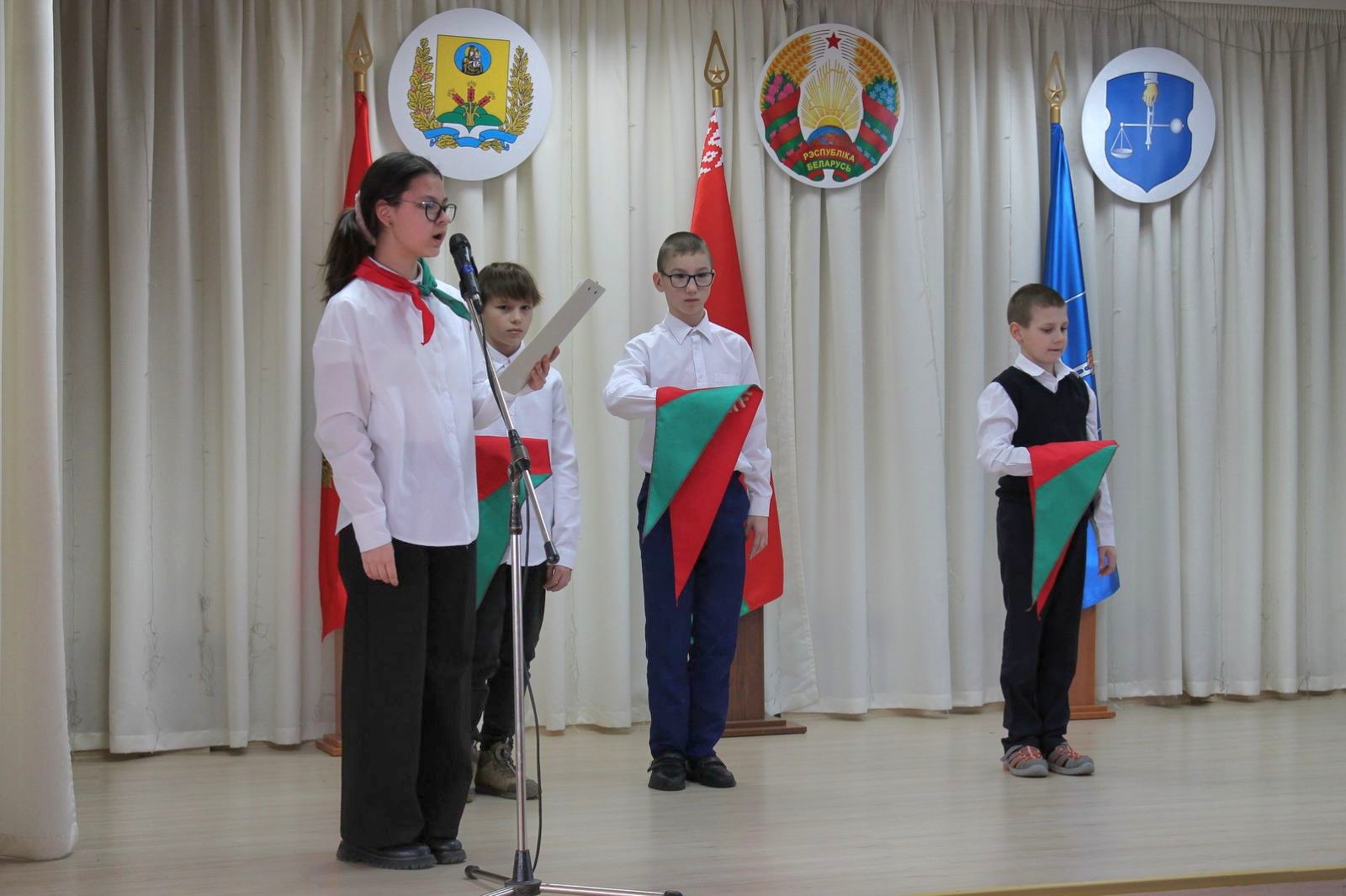 🔸 Новые учащиеся произнесли Торжественное обещание и вступили в БРПО. Им повязали пионерские галстуки.